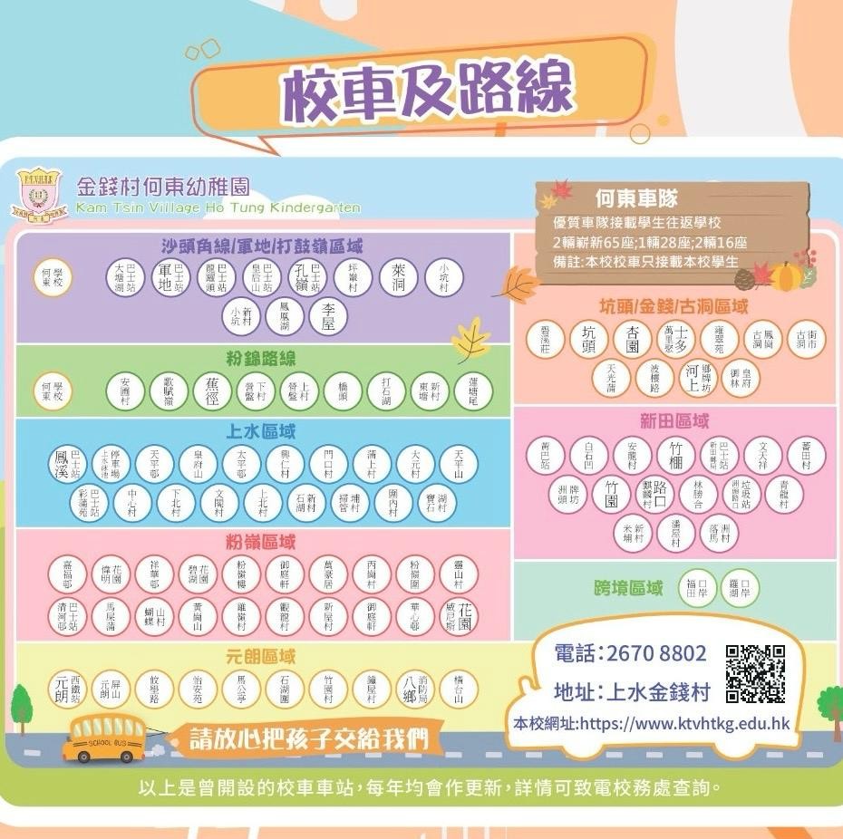 本校採用何東運輸公司校車,該校車公司主要接載金錢村何東幼稚園及金錢村何東學校之學生,避免與其他校外人宜士共用校車,能於時間管理和學生安全上有更大的保障。本校亦會安排本校教職員於車上照顧乘坐校車的學生及維持秩序,以確保學生的安全。